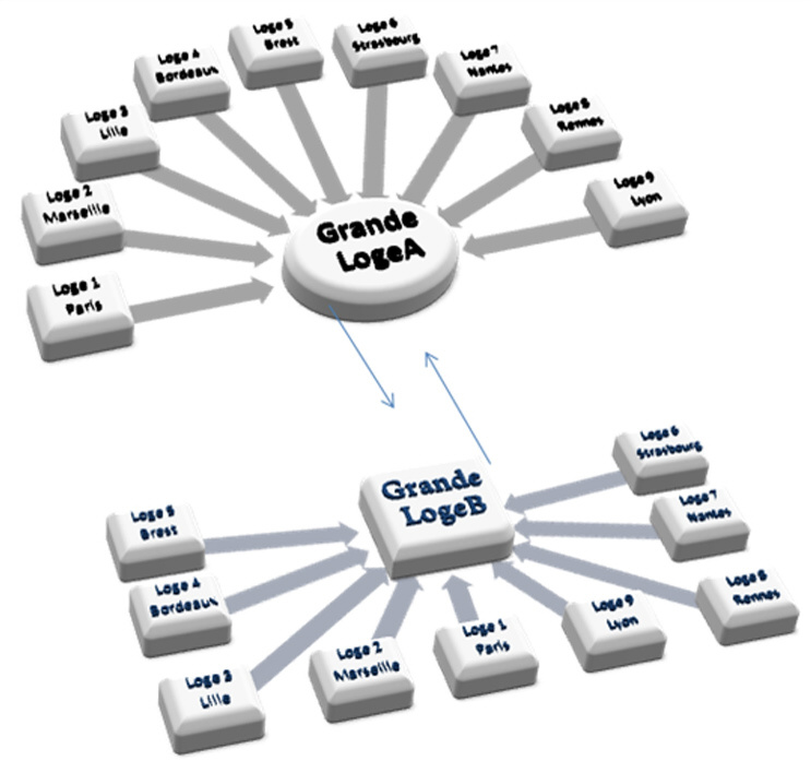 En fin d’ouvrage le chapitre Glossaire détaille ce qu’est une Loge ou une Grande Loge. Pour vous permettre de mieux appréhender l’organisation maçonnique des Loges, je vous propose un schéma comportant un exemple avec deux Grandes Loges et ses Loges respectives.
